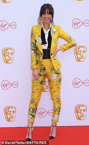 اتسمت إطلالة الممثلة البريطانية بالغرابة والتشويش، فاختارت بدلة توكسيدو صفراء بطبعة على شكل طيور اللقلق والمناظر الاستوائية.