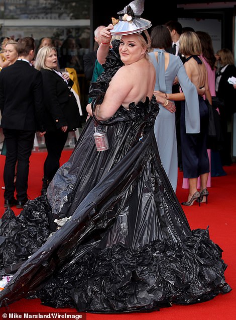 بدت النجمة الكوميدية ككيس قُمامة بفستانها الأسود الضخم، كما أكملت زينتها بأبريق شاي معدني، وقبعة ضخمة معدنية.