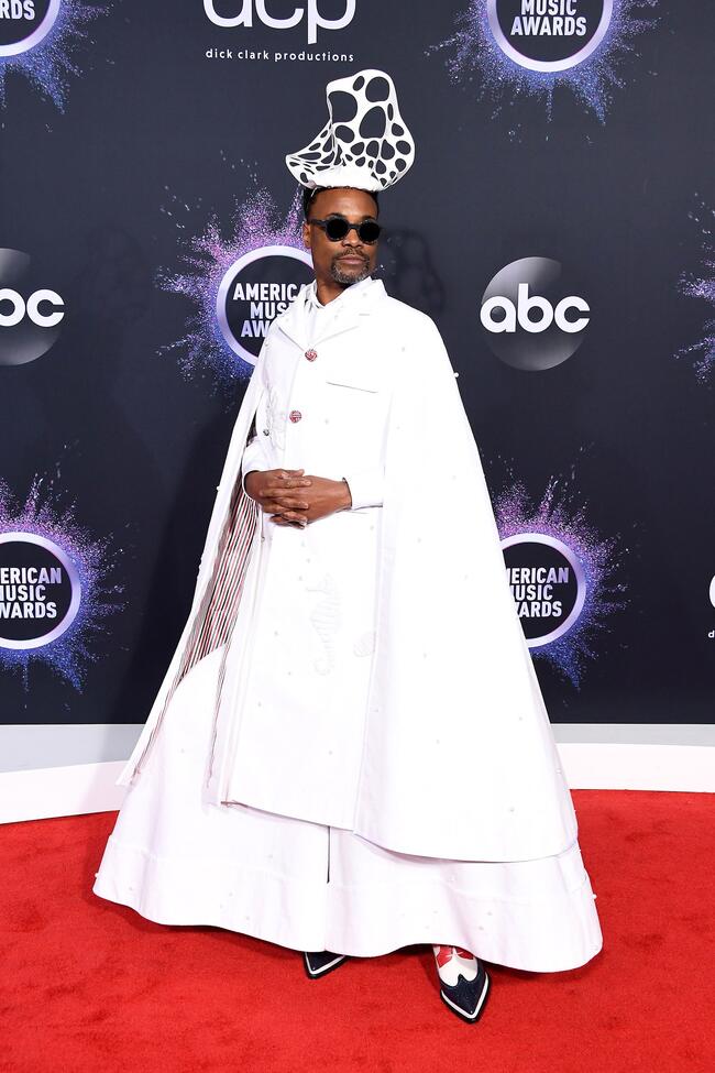 لا أحد أشد غرابة من الاستعراضي "بيلي بورتر" الذي دائمًا ما يختار أزياء ذات طابع أنثوي ورجولي في ذات الوقت، وقد ارتدى لهذه المناسبة إطلالة من توقيع مصمم الأزياء الأمريكي "توم براون" و" أشبه ما تكون ببدلة رسمية بيضاء وفستان أبيض ذي تنورة منفوشة، بينما انسدلت على كتفيه كاب أبيض عريض.