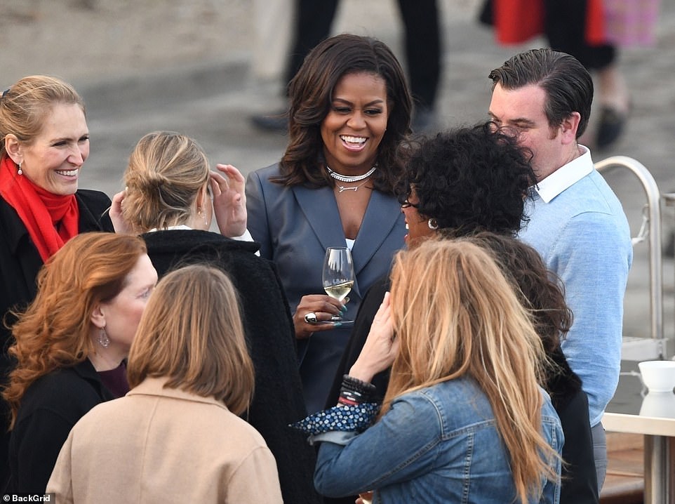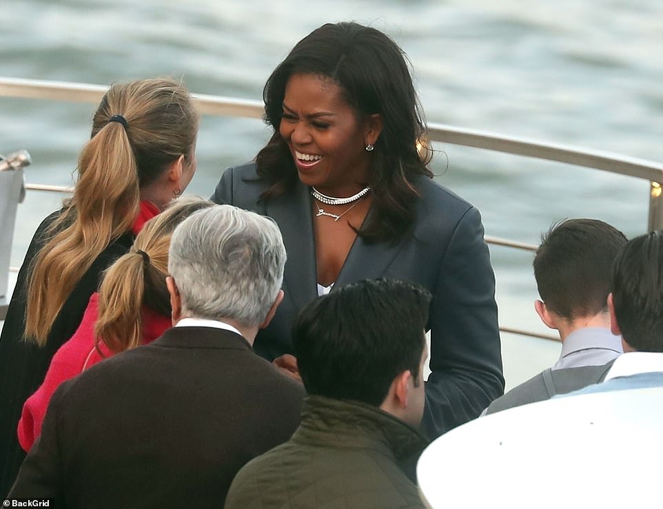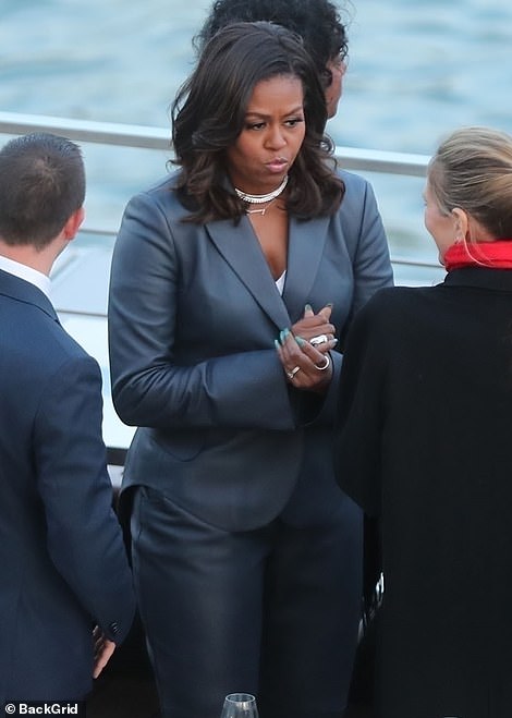 والتقطت عدسات الباباراتزي ميشيل مساء يوم الاثنين عندما استقلت قارباً مع زميلاتها على الجانب الآخر من برج إيفل، وانطلقوا على طول نهر السين، وكانت السيدة الأولى تحتسي النبيذ وتبتسم بينما كانت تتحدث مع ضيوفها الآخرين، وهم يتجولون عبر المعالم الاثرية الشهيرة في باريس.