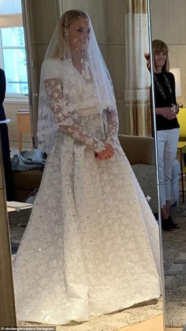 وظهرت صوفي في فستان الزفاف الأبيض المذهل، الذي جاء بقصة الكسرات العريضة من الأسفل، ومرّصع بالستراس والزهور، أما أكمامه فكانت من الدانتيل.