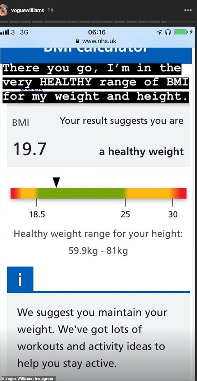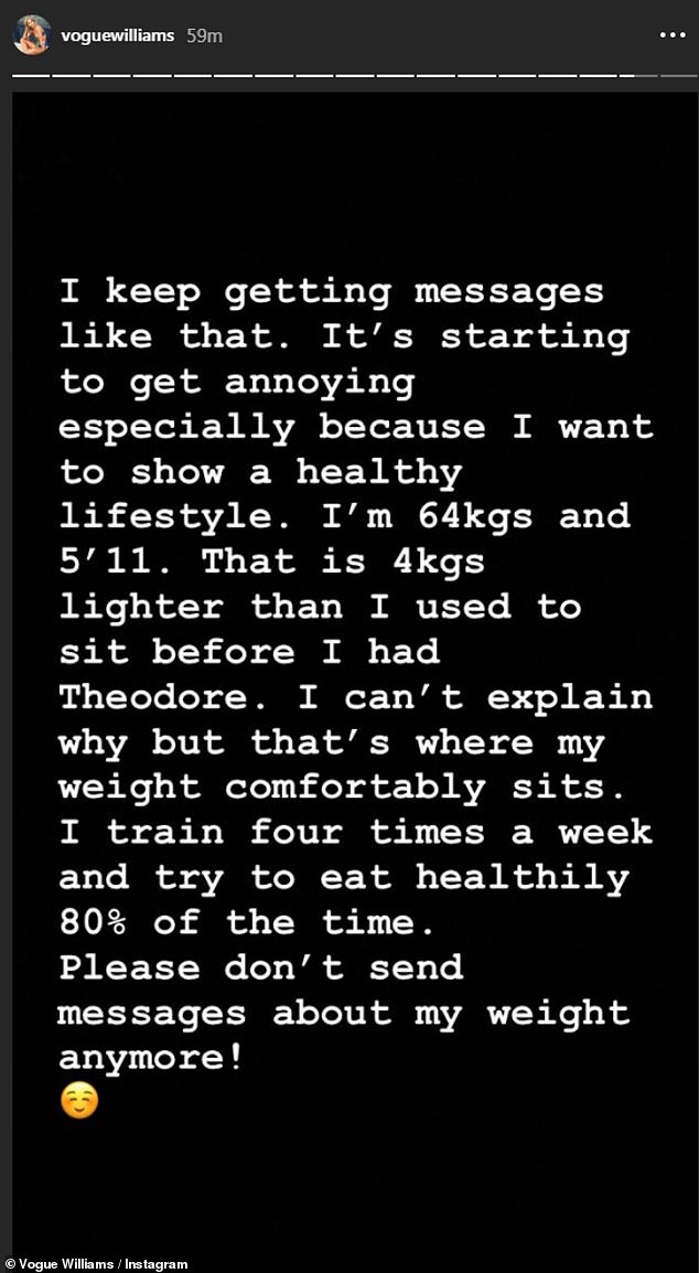 ولم تكتفِ "فوغ" بهذا الحد، بل بعثت رسالة لمتابعيها عبر خاصية "إنستغرام ستوري"، جاء فيها: "مثل هذه الرسائل مستمر، لقد بدأ الأمر يزعجني وخاصة أني أوَّد استعراض نمط حياتي الصحي.. فأنا أبلغ من الوزن 64 كيلو غرام ويصل طولي إلى 1.56 متر، وهو أقل بأربعة كيلوجرامات عن وزني قبل ولادة ثيودور."