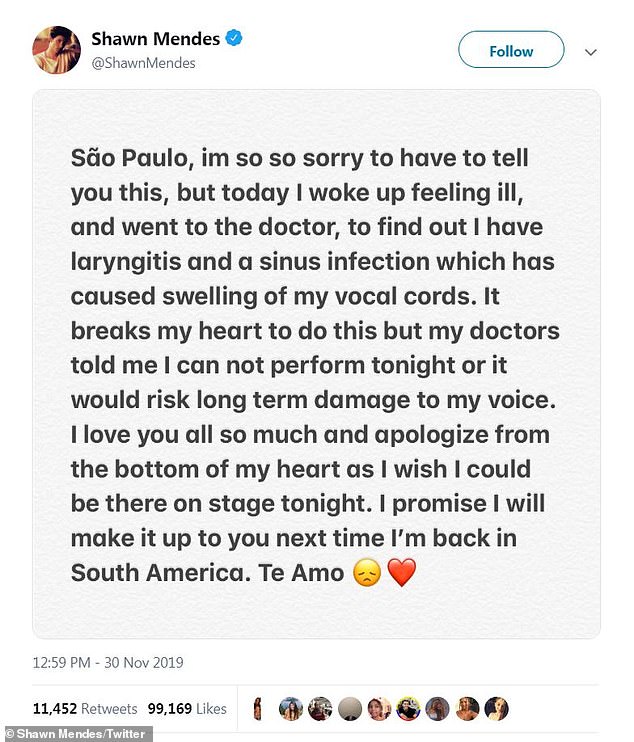 وكتب: "ساو باولو، اعتذر عن إخباركم بهذا النبأ، لكني استيقظت اليوم وأنا أعاني من المرض، وزرت الطبيب لأكتشف أني مصاب بالتهاب الحنجرة بالإضافة إلى التهاب الجيوب الأنفية، ما سبب تورم في حبالي الصوتية."