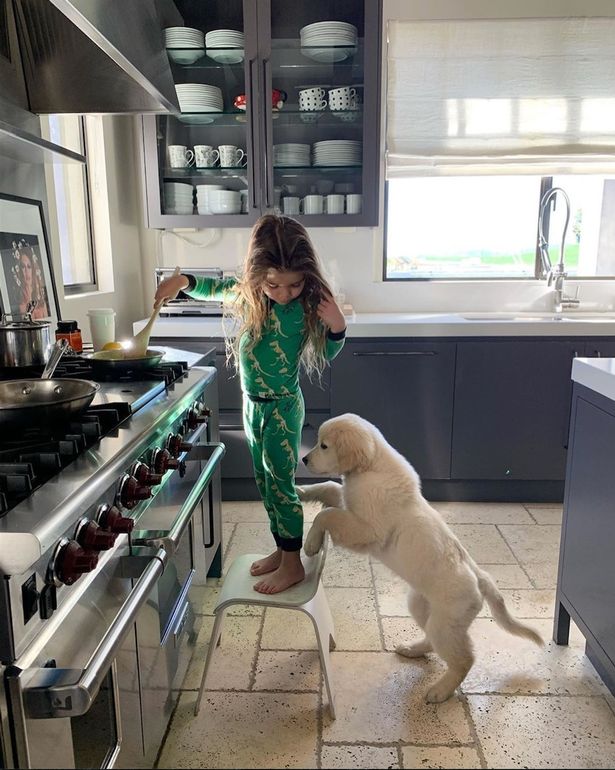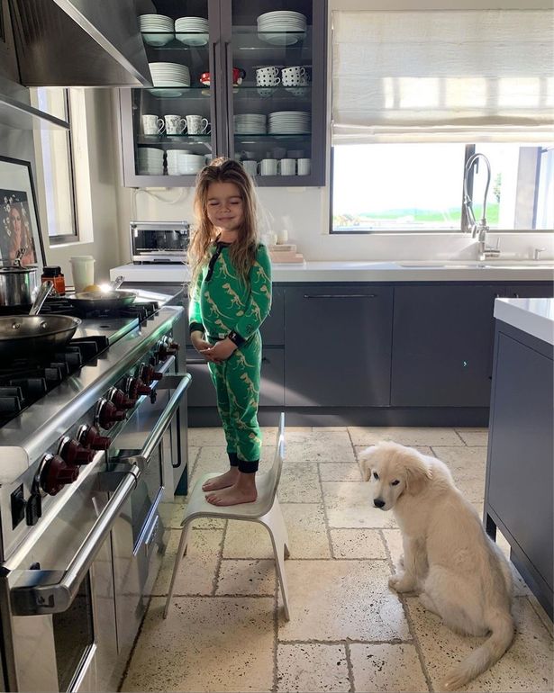 شاركت "كورتني كارداشيان" صورة لطفلها واقفًا على كرسي بلاستيكي أمام الموقد مُرتديًا بيجامته الخضراء، ومسدلًا خصلات شعره الأشقر الطويل على جانبي كتفه، وعلَّقت: "صباح الخير من الطاهي رين وكلبنا كابس".