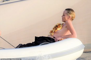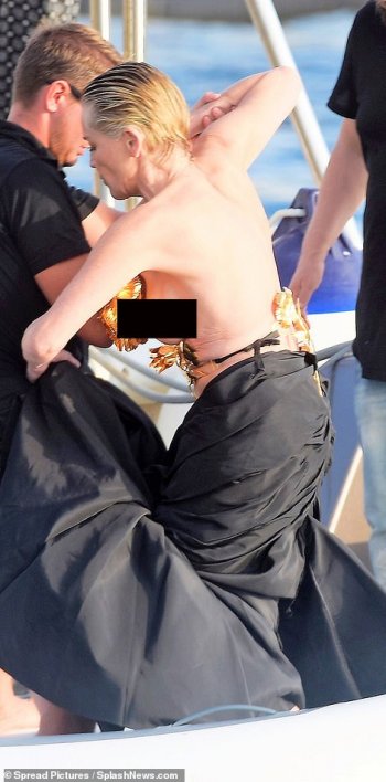وانضم إلى النجمة فريق العمل الكامل وذلك لمساعدتها على النزول من القارب والسير على الشاطىء وحتى أن تصميم الفستان لم يساعدها في تغطية صدرها العاري خلال سيرها.