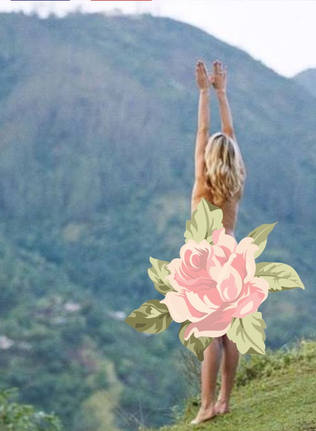 تظهر السيدة العارية في الصورة واقفةً أمام مظهر طبيعي فاتن، بينما يديها ممدودتان عاليًا، وشعرها الأشقر المموج مُنسدل وراء كتفها.