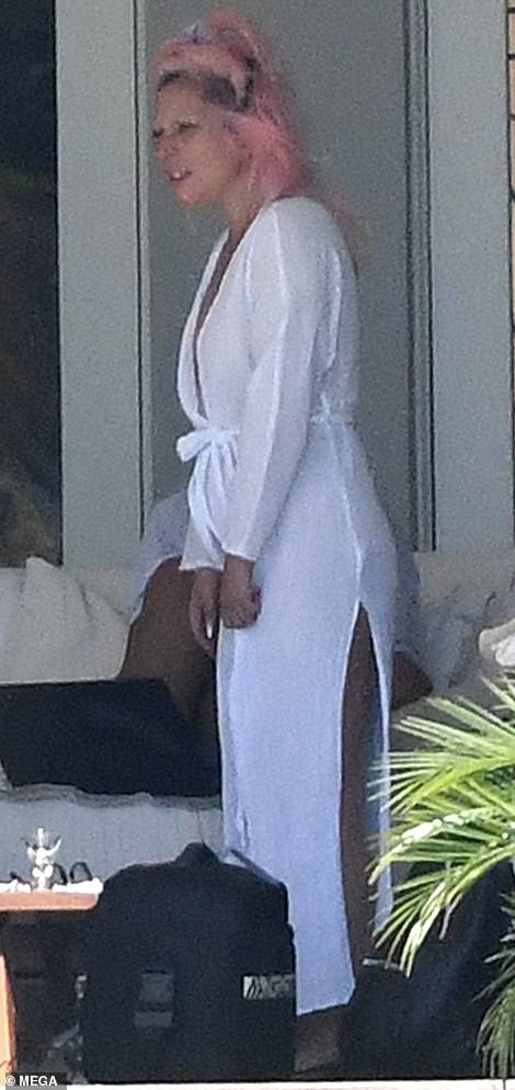 واختارت "غاغا"البقاء عارية مُسدلةً كارديجان طويل أبيض من الشيفون بحزام التف حول خصرها، كما شوهدت مرتدية ملابس سباحة مؤلفة من توب رياضي أسود ولباس تحتي مستعرضةً منحنيات جسدها، في حين عقدت خصلات شعرها الوردي نصف رفعة، و لم تطبق أي مستحضرات تجميل على بشرتها.