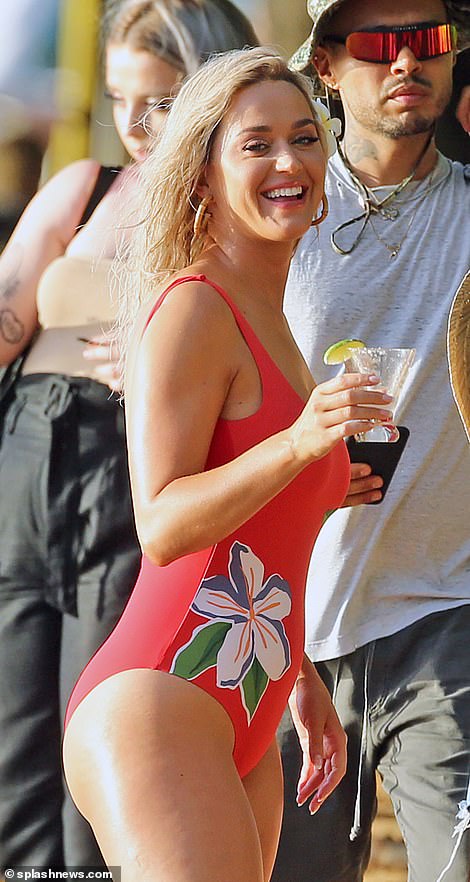 وظهرت كاتي بإطلالة صيفية مثيرة، إذ ارتدت مايوه من قطعة واحدة باللون الاحمر، مطبوع عليه زهور البلوميريا البيضاء، كما وضعت واحدة من هذه الزهور على جانب شعرها المبتل والمموج.