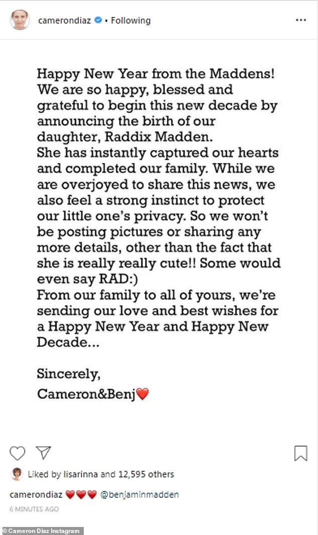 لكن يوم أمس الجمعة فجّرت كاميرون خبرًا مع معجبيها عبر حسابها الخاص على انستغرام إذ كشفت عن ترحيبها بأول فرد في عائلتهما الصغيرة وهي ابنتهما المولودة حديثاً وأسمتها "ريدكس مادن".