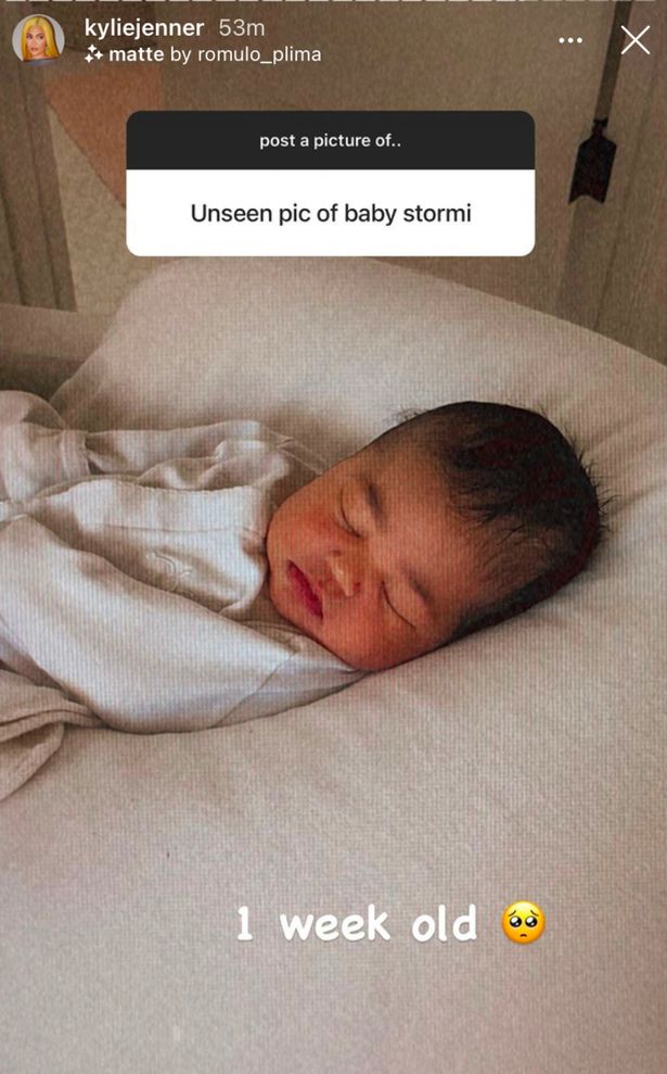 وطلب أحد معجبيها نشر صورة لطفلتها لم تشاركها مسبقًا، وعلى الفور نشرت "كايلي" صورة لـ"ستورمي" بعمر الأسبوع مُستغرقةً بالنوم ومُستلقيةً على السرير بردائها الأبيض.