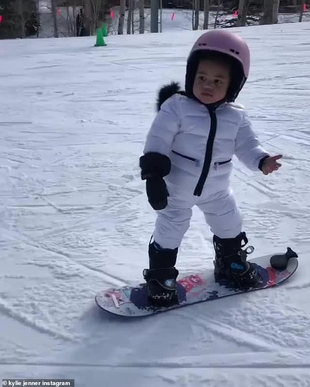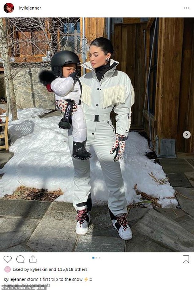 أما ستورمي فلم تقل أقل أناقة من والدتها الملياردية العصامية حيث ارتدت بدلة مطابقة تماماً لكايلي لكن بوجود فرو حول رقبتها كما ارتدت خوذة حماية سوداء مع قفازات وحذاء مطابق اللون.