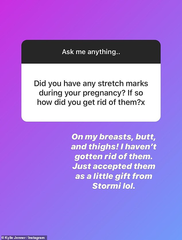 وجاء جواب صاحبة امبراطورية Kylie Cosmetics ، كالتالي: "حول صدري، ومؤخرتي، وأردافي..لم أتخلص من العلامات، لكني تقبلتها فحسب؛ وكأنها هدية طفلتي "ستورمي"."