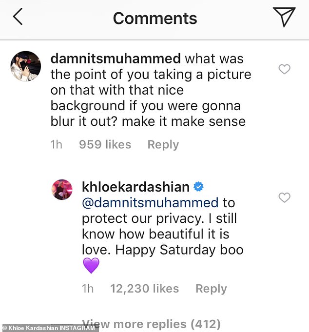 وظهرت كلوي في الصورة التي نشرتها عبر حسابها الخاص على "إنستغرام"، وهي جالسة على عجل السّباحة الوردي، مرتديةً بيكيني وردي، وتبدو بحالة مزاجية جيدة برفقة ابنتها "ترو"، لكن سرعان ما تضاءلت هذه الحالة المزاجية لدى نجمة تلفزيون الواقع، عندما أخبرها أحد المتابعين معلقاً على الصورة "ما الهدف من التقاط صورة بخلفية جميلة إذا كنت لن تظهريها؟اجعليها منطقية وأظهريها لنراها"، وكانت كلوي سريعةً من خلال ردّها على المتابع قائلةً: "لحماية خصوصيتنا، مازلت أعرف كم هي جميلة..سبت سعيد".