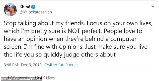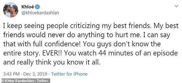 وحذرت كلوي المتابعين من التحدّث بشكل سيء عن صديقتيها الشقيقتان مليكة وخديجة حق وذلك بعد رؤيتهما في مسلسل الواقع KUWTK تعملان خلف الكواليس مع حبيبها السابق تريستان لوضع خطة لمحاولة عودته لكلوي.