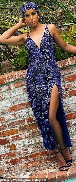 وبالانتقال إلى كيري واشنطن والتي تألقت بارتدائها فستان ضيّق باللون النيلي والذهبي وبفتحة كبيرة جهة الصدر بالإضافة إلى شق كبير على طول الفخذ