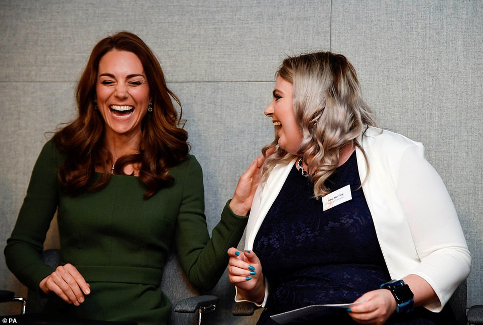 وخلال وقت لاحق، شوهدت دوقة كامبريدج في حالة معنوية إيجابية وهي تضحك بعد أن تمنت زميلتها إيمي هيرينج الحظ السعيد لها قبل خطابها، ولم تفارق البسمة وجه دوقة كامبريدج خلال تحدثها مع الاطفال هناك.