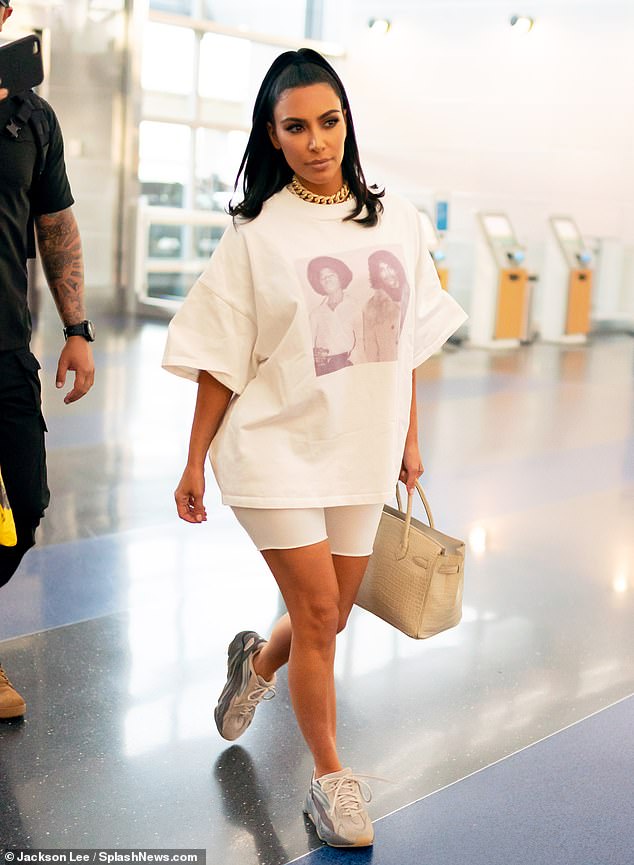 توجَّهت "كيم كارداشيان" إلى مطار جون كينيدي في مدينة نيويورك يوم أمس الثلاثاء، واختارت إطلالة كاجوال مُريحة مؤلَّفة من قميص فضفاض أبيض من العلامة التجارية ُEsty يبلغ سعره 21 دولار، طُبع عليه صورة نجم البوب الراحل "مايكل جاكسون" وإلى جانبه النجم العالمي المُتوفى "برينس" في فترة شبابهما، ونسَّقته بشورت ليغينغ أبيض.