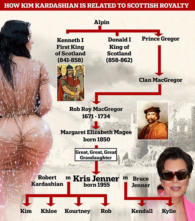 وفق ما نقله موقع "ديلي ميل" البريطاني، يُشار أن "كيم كارداشيان" وعائلتها من أقارب البطل الأسكتلندي الخارج عن القانون "روبرت روي ماكجريجور"، وأحد الملوك الاسكتلنديين.