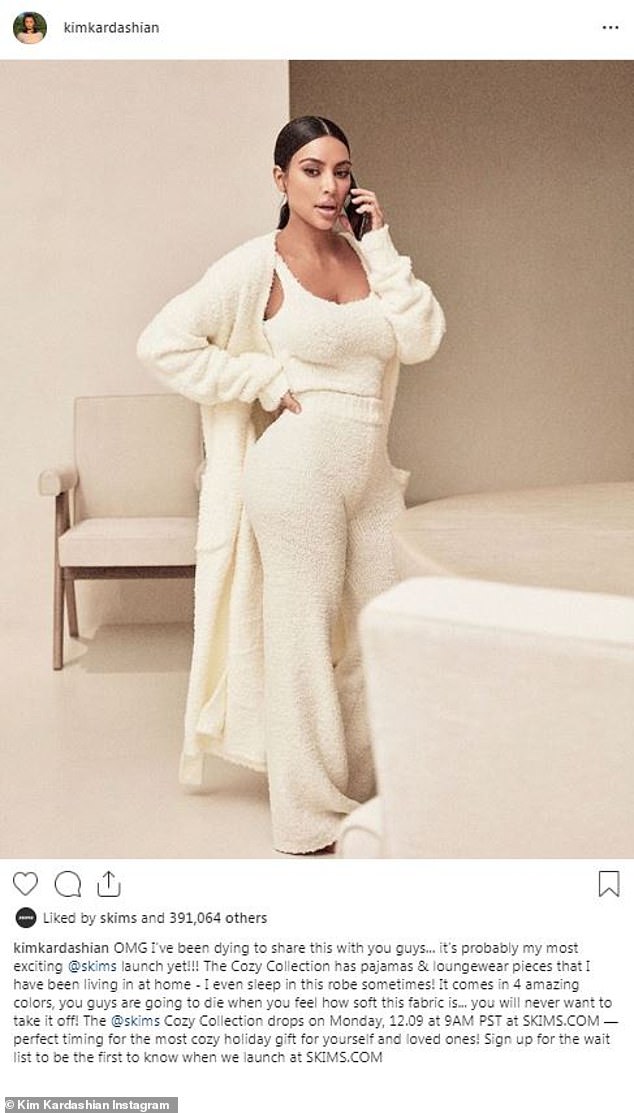 وكشفت كيم عن مفاجأتها بصورة لها وهي ترتدي إحدى تصاميم مجموعتها الجديدة، وقالت: "يا إلهي.. كنت متشوقة للغاية مشاركتكم هذا الخبر..سأطلق مجموعة جديدة تدعى ذا كوزي كوليكشن لملابس المنزل والملابس المريحة، فأنا حتى أنام مرتدية هذا الروب".