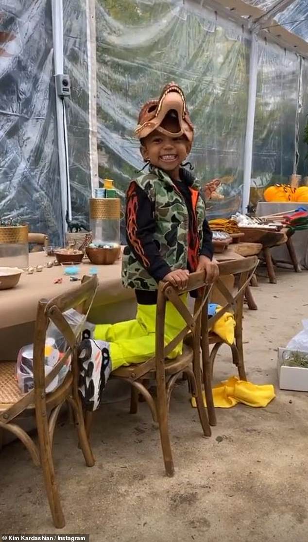 وقامت نجمة الواقع البالغة من العمر 39 عاماً بتصوير مقطع فيديو من داخل الحفل ونشره لمتابعيها عبر انستغرام حيث ظهر فيه سانت وهو سعيد للغاية بينما كان يرتدي بنطال أصفر نيون وبلوزة سوداء كما كان يضع قناع الديناصور على وجهه.