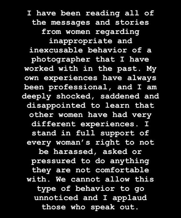 وتحدّثت حول ذلك بقولها: "لقد قرأت جميع القصص المتعلقة بسلوك الجنسي السيء للمصور الذي عملت معه في الماضي، وأنا أؤيد حق كل امرأة في الدفاع عن نفسها ضد أي مضايقة أو ضغط أو سلوك سيء".