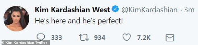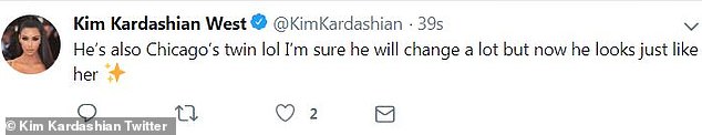وشاركت كيم الخبر السار عن ولادة الطفل مع معجبيها عبر حسابها الخاص على "تويتر" صباح أمس الجمعة، حيث علّقت: "لقد وُلد الطفل، وهو جيّد"، كما أضافت: "إنه يشبه ابنتي شيكاغو طبق الأصل، أنا متأكدة من أنه سيتغير كثيراً، لكن الآن يشبهها تماماً".