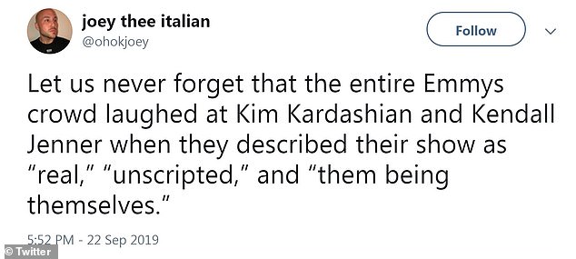 وعلى الفور، انهال رواد مواقع التواصل الاجتماعي عبر حساباتهم على موقع "تويتر" تعليقًا على كلامهما، فكتب أحدهم: "دعونا لا ننسى كيف ضحك الجماهير على كيم وكيندال حينما وصفتا برنامجهم بالحقيقي، المرتجل، وأنهن يتصرفن على طبيعتهن".