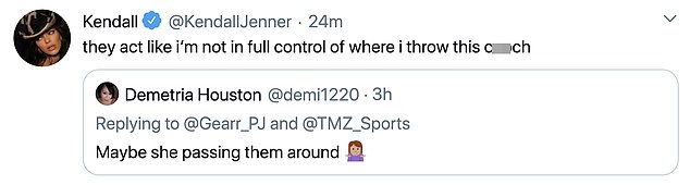 وقرر أحد محبي "كيندال" الدفاع عن نجمته، وأوضح أنها هي من تنتقل بينهم وليس هم، وأثار التعليق انتباه "جينر"، التي كتبت: "يتصرفون وكأنني لست متحكمةً بالكامل في المكان الذي أرمي فيه هذا الم*بل".