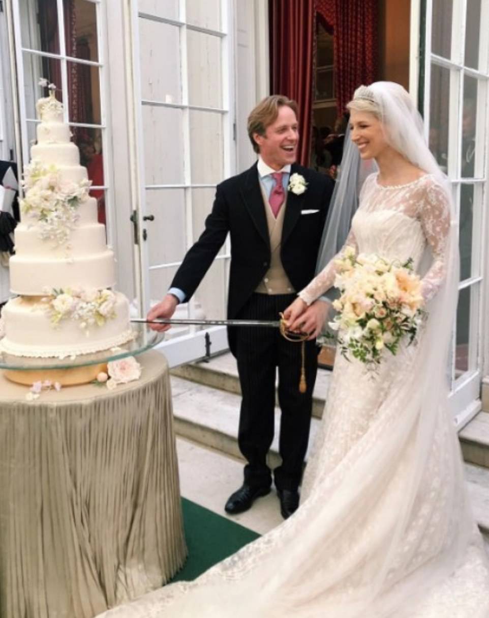 وتُظهر الصور ليدي غابرييلا وهي بجانب عريسها توماس كينغستون، بينما كانا يمسكان السيف لتقطيع كعكة الزفاف المكوّنة من ثماني طبقات، حيث نشرت مصممة الكعكة فيونا كيرنز الصورة، وعلّقت بجانبها: "العروس الجميلة غابرييلا ويندسور وزوجها السيد توم يقطعان كعكة فيونا كيرنز للزفاف، لقد تشرفنا جداً بصنع كعكة الزفاف الملكية هذه، كما لنا الشرف بأن نكون جزءاً من هذا اليوم الخاص".
