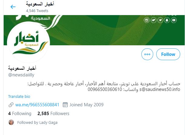 تداولت مواقع التواصل الاجتماعي خبر متابعة "ليدي غاغا" صحيفة سعودية تحمل اسم "أخبار السعودية" عبر موقع التغريدات القصيرة "تويتر"، وبدا واضحًا أن الصفحة غير رسمية وغير موثَّقة بالعلامة الزرقاء، وهو أمر مفاجئ وصادم في ذات الوقت.