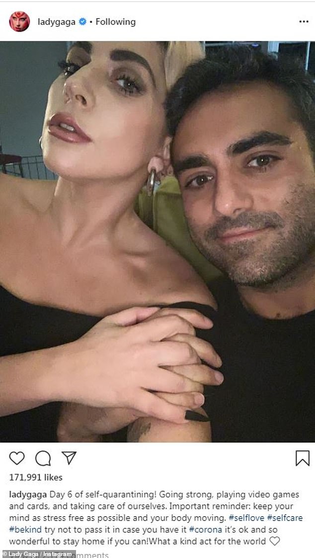 وأرفقت "غاغا" الصورة العاطفية بتعليق، جاء فيه: "اليوم السادس في الحجر الصحي! نحاول البقاء أقوياء، ونستمتع بلعاب الفيديو والبطاقات، ونعتني بأنفسنا".