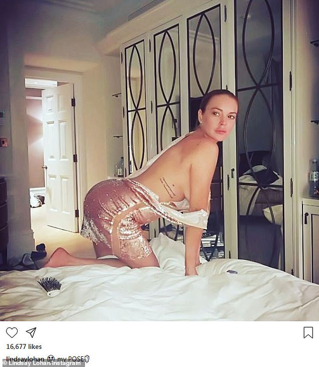 ظهرت ليندسي بفستان لامع وردي، مفتوح من جهة الظهر، حيث ظهر وشمها أسفل صدرها، بينما كانت بحركة القرفصاء على السرير وهي تحدّق للكاميرا، كما اعتمدت تسريحة الكعكة.