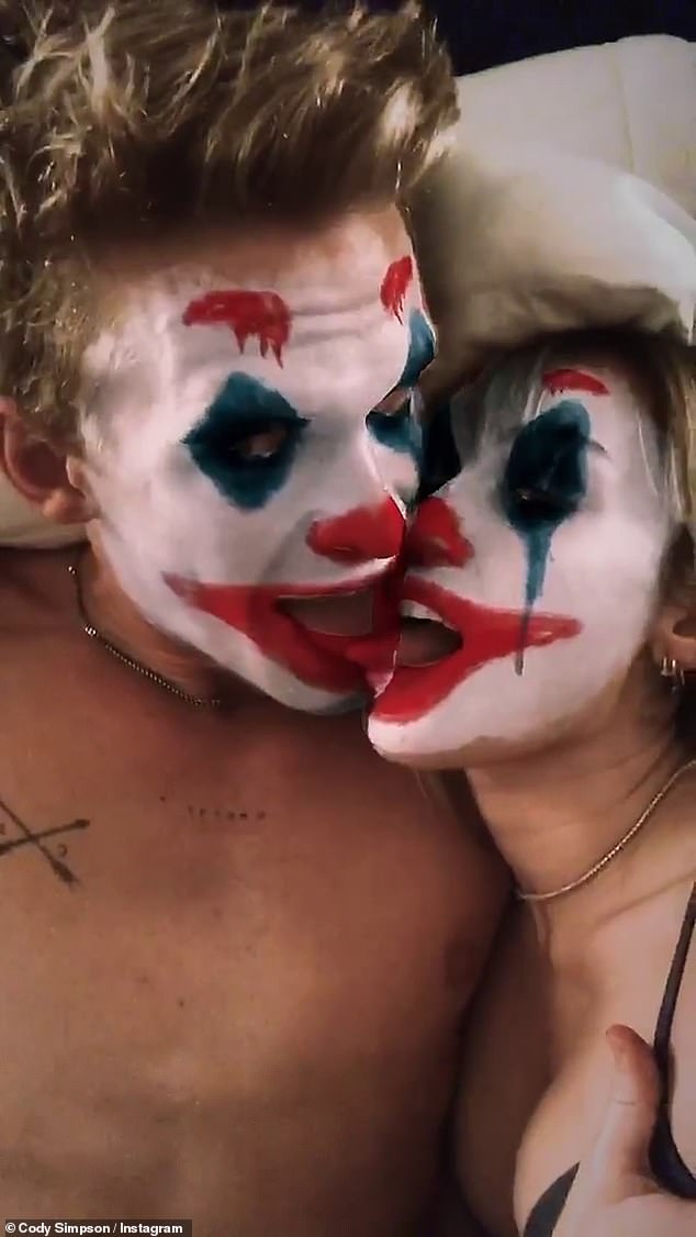 وبنفس الأسلوب المتبع نشرت مايلي عبر حسابها على إنستغرام صورةً حميمية للثنائي أثناء جلوسهما على السرير وهما يرتديان ملابسهما الداخلية، بينما كانا قد رسما على وجههما شخصية الجوكر.