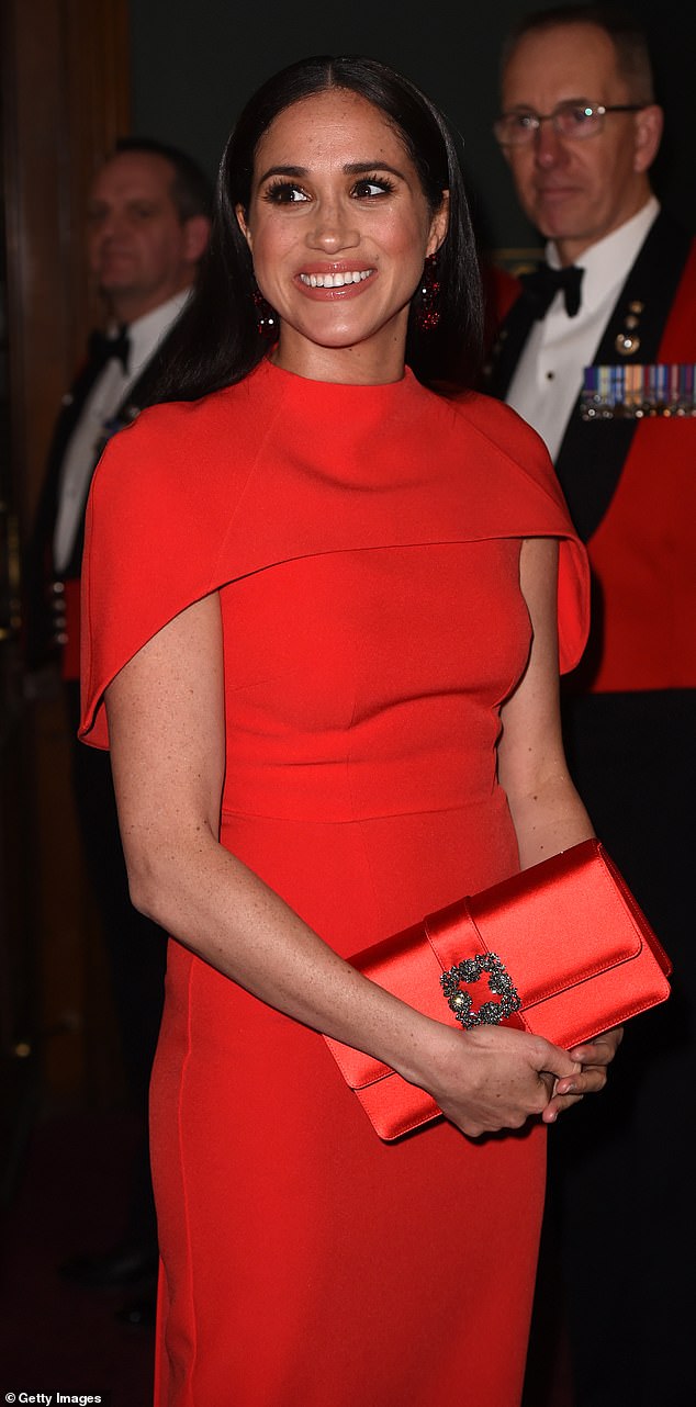 ويأتي إختيارها هذا اللون المفعم بالقوة تماشيًا مع الزي الذي ارتداه زوجها الأمير"هاري" كقائد جنرال للقوات المارينز الملكية.