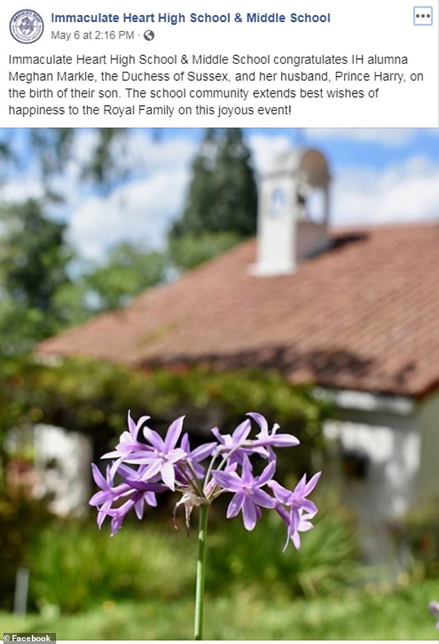 من جهة أخرى، نشرت المدرسة رسالة تهنئة لدوقي ساسكس عبر موقع "فيسبوك" بعد فترة وجيزة من تأكيد ولادة طفلهما الأول، جاء فيها:"تهنئ مدرسة Immaculate Heart High School إحدى طالباتها السابقات ميغان ماركل، دوقة ساسكس وزوجة الأمير هاري،  بولادة طفلهما.. ويقدم مجتمع المدرسة تمنياته بالسعادة للعائلة المالكة لهذا الحدث البهيج! "