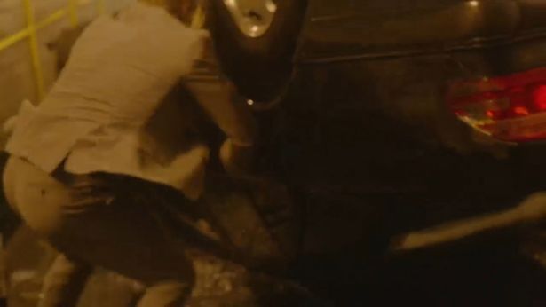 وفي لقطة أخرى ظهرت ميغان ماركل والتي قامت بأداء دورها النجمة سيدني مورتون وهي مستلقية تحت حطام السيارة ومحاطة بالباباراتزي والإعلام من جميع الجهات، قبل أن يهرع الامير هاري والذي يؤدي دوره جوردان دين إلى باب السيارة لإنقاذها.