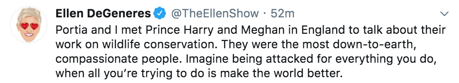 مع ذلك، دعمت مقدمة البرامج الكوميدية "ألين دي جينيريس" الزوج الملكي، ودافعت عنهما عبر تغريدة نشرتها عبر حسابها على موقع "تويتر" مُستذكرة اليوم الذي التقته بهما، جاء فيها: "التقينا أنا وبورتشا بميغان وهاري في إنجلترا للحديث عن خططهما لحماية الحياة البرية، كانا شخصين متواضعين وشغوفين".