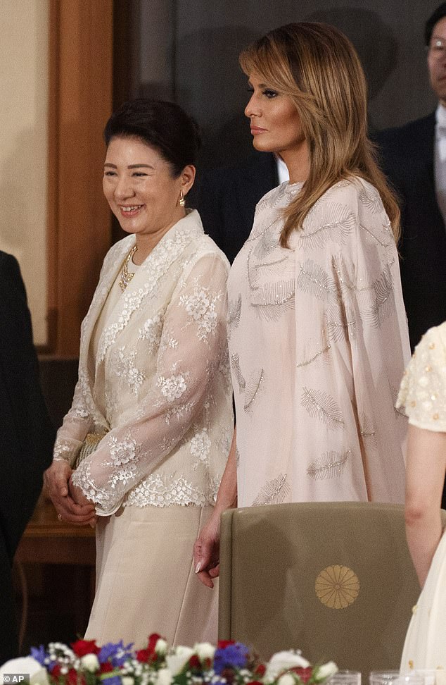 استقبل الإمبراطوران الثنائي دونالد وميلانيا خارج مدخل القصر، قبل مأدبة الطعام، حيث كانت الإمبراطورة ترتدي فستاناً ناعم نسّقته مع جاكيت دانتيل بأكمام شفافة، وجلس الزوجان على الطاولة.