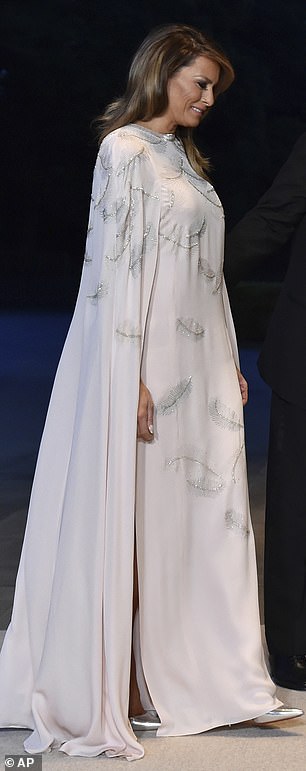 واختارت ميلانيا قفطاناً أنيقاً ليتماشى مع مناسبة تناول العشاء في القصر، بتكلفة 4,490 دولار من مجموعة J. Mendel، إذ كان القفطان من القماش الوردي الناعم، المزيّن بتطريز فضي بأشكال الريش، كما أسدل وشاح من الكتفين، عدا عن الأقراط الماسية التي تناسبت مع التطريز الفضي.
