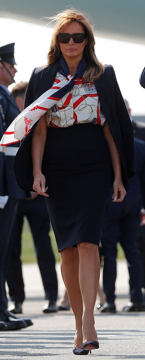 تميزت البلوزة بطبعة على شكل الميداليات العسكرية، والذي يعد بمثابة تكريم للاحتفال بمناسبة الذكرى الـ 75 ليوم " الإنزال النورماندي" D-Day، والذي من المقرر أن يحتفل به الرئيس الأمريكي وزوجته خلال هذا الأسبوع.