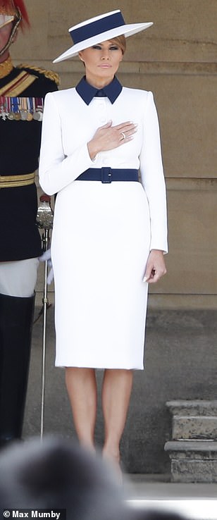 فبحسب ما نشرته صحيفة " ديلي ميل" البريطانية، اختارت سيدة أمريكا الأولى اطلالة من توقيع "دولتشي آند غابانا"، والتي تميزت بمزيج الألوان المفضل لدى الأميرة الراحلة "ديانا"، وهو الأبيض مع الكحلي.