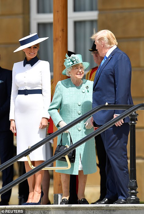 وبذكر زيارة الرئيس الأمريكي وزوجته لقصر باكنغهام، لا يمكننا تجاهل إطلالة الملكة إليزابيث، والتي تألقت بفستان مزين بنقشات الورود الملونة نسقته مع معطف وقبعة بدرجة زاهية من الأخضر، بينما أكملت اطلالتها بحذاء وحقيبة باللون الأسود وقفازاتها المعهودة.