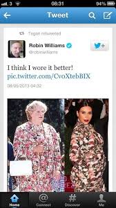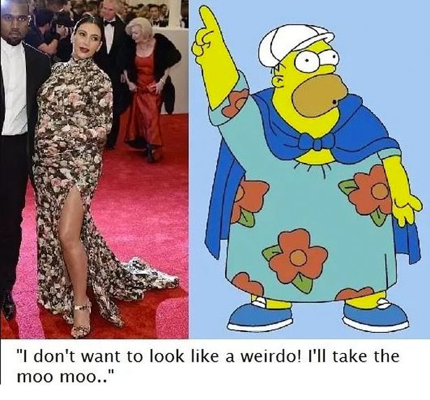 وشبَّه رواد مواقع التواصل الاجتماعي فستانها بلقطة من مسلسل الرسوم المتحركة "عائلة سيبمسون"، بالإضافة إلى تشبيهه بالأريكة والستائر، لكن التعليق الأشد إذاءً حينما نشر النجم الأمريكي الراحل "روبن ويليامز" صورة يقارن فيها الشخصية التي أداها في فيلم " السيدة روبتفاير"، حيث تنكر كسيدة عجوز ترتدي فستانًا مورَّدًا، وبين "كيم"، وأرفقها بتعليق، جاء فيه: "أعتقد أني ارتديته بشكل أفضل".