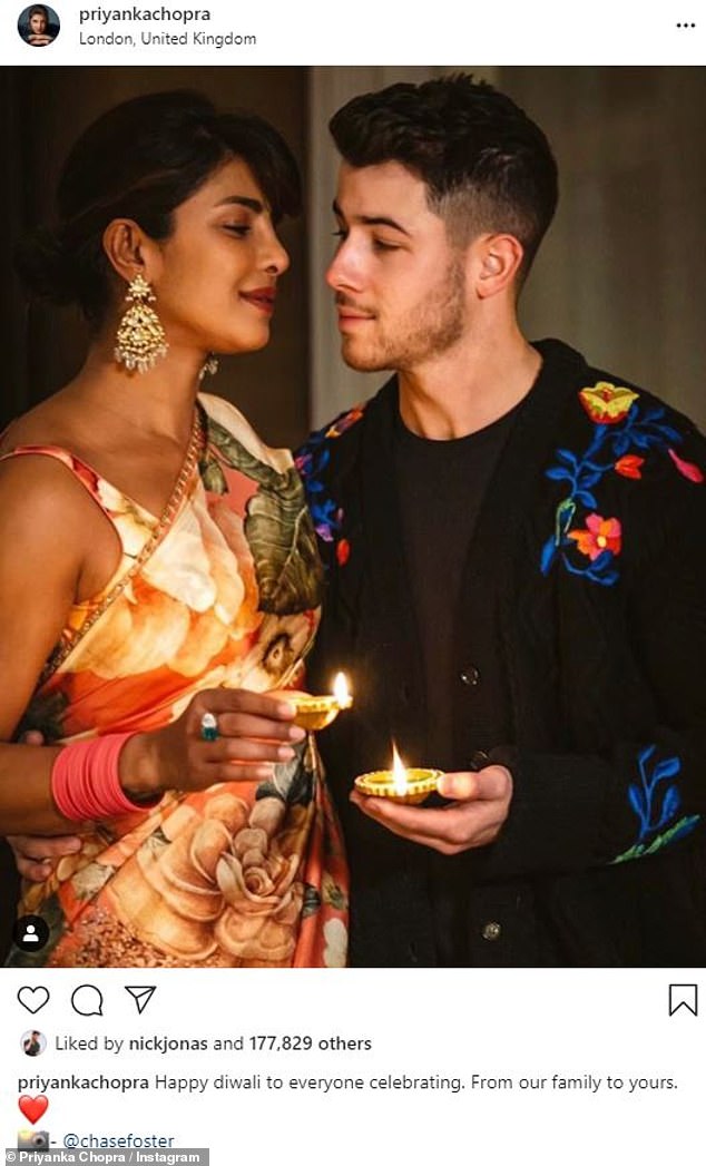 احتفلت النجمة البوليوودية "بريانكا شوبرا" وزوجها المغني الأمريكي "نيك جوناس" بعيد الديوالي الهندوسي يوم السبت الماضي في العاصمة البريطانية لندن.