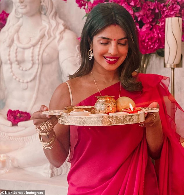 وأمسكت "شوبرا" ونيك" الشموع الخزفية الاحتفالية الذي تضاء في ديوالي، وهو أضخم احتفال في التقويم الهندوسي.