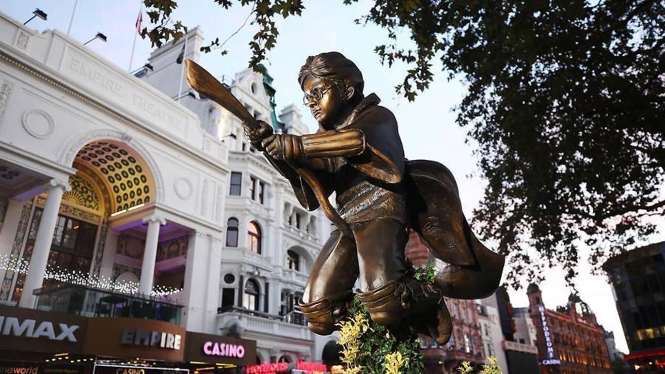 أسدل الستار عن نصب تذكاري برونزي لأبرز شخصيات سلسلة الأفلام الخيالية Harry Potter في ساحة ليستر المخصصة للمشاة في غرب لندن.