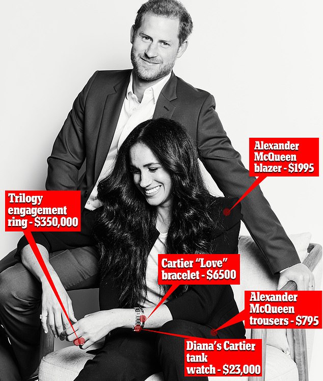 من جهة أخرى، ارتدت "ميغان" (39 عامًا) بذلة سوداء أنيقة من تصميم "أليكساندر ماكوين" يبلغ سعرها 3 آلاف دولار، وتزيَّنت بخاتم خطوبتها الألماس الذي يقدر سعره بـ350 ألف دولار، وساعة كارتييه ذهبية بقيمة 23 ألف تعود لحماتها المتوفاة، بالإضافة إلى اسوارة الحب الخاصة بـ"كارتييه" يقيمة 6.6 ألف دولار.