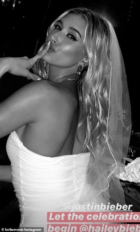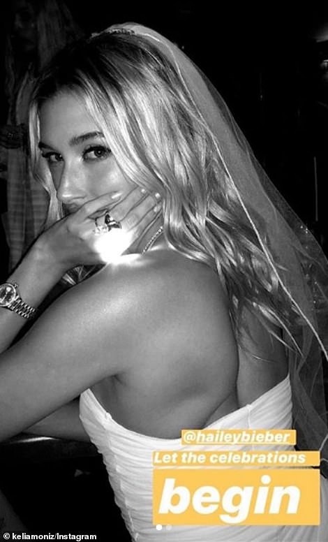 تألَّقت "هايلي" مُرتديةً فستان أبيض سترابلس أنيق، وأسدلت طرحة بيضاء على شعرها الأشقر المموج، بينما أضفت لمسة من اللمعان إلى إطلالتها مُتزيِّنةً بإكسسوارات ألماسية بسيطة، وزادت من طولها طولًا بانتعال حذاء كريستالي مُرَّصع بالمجوهرات كحذاء ساندريلا.
