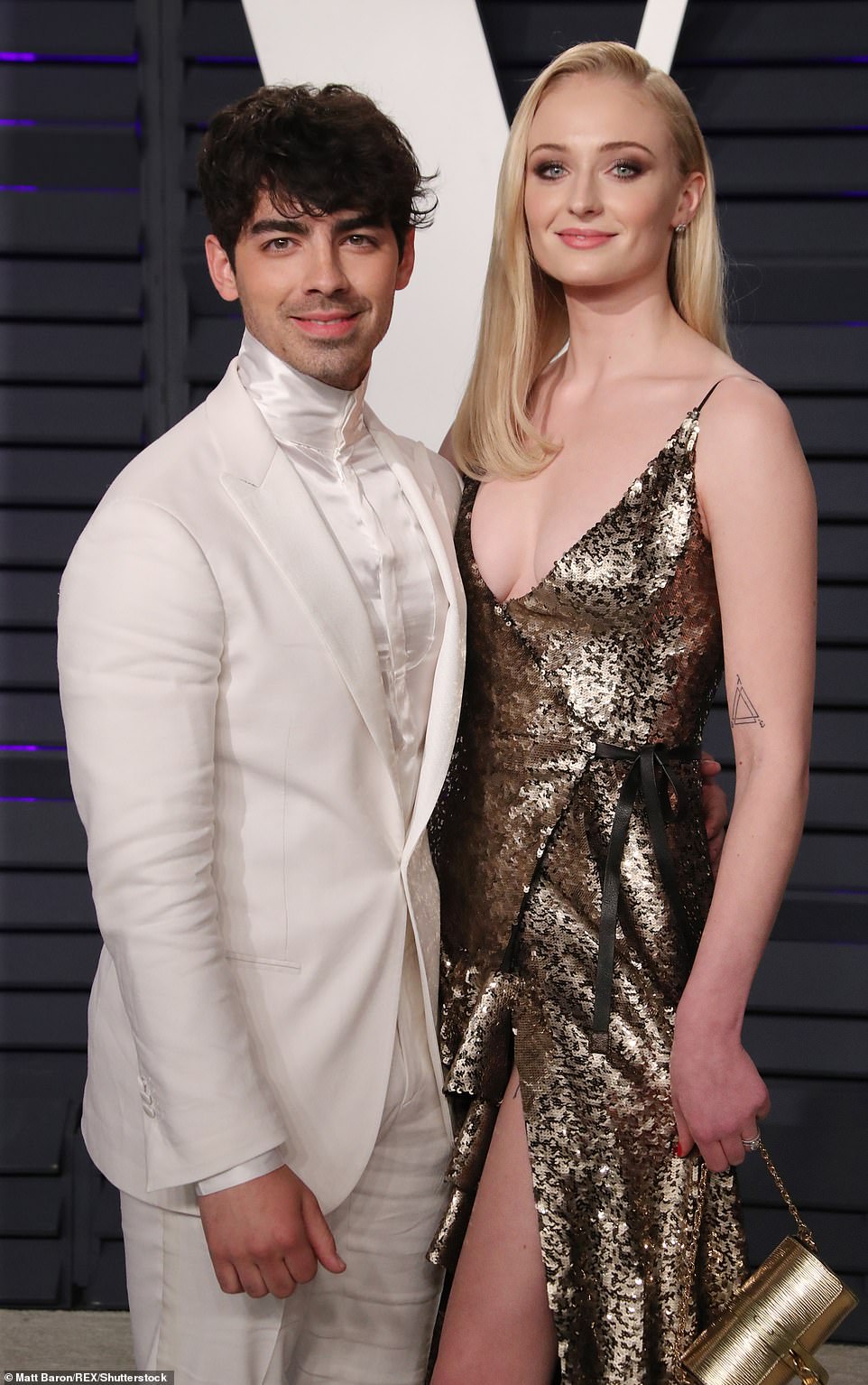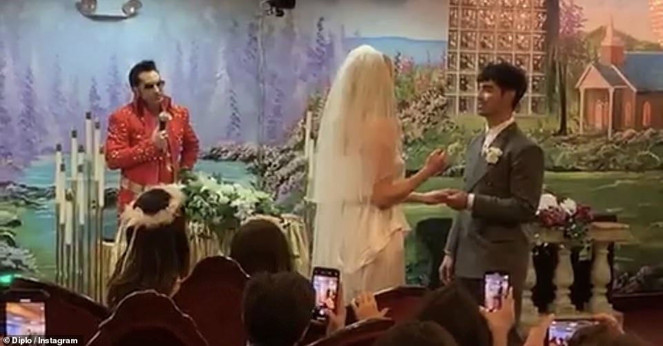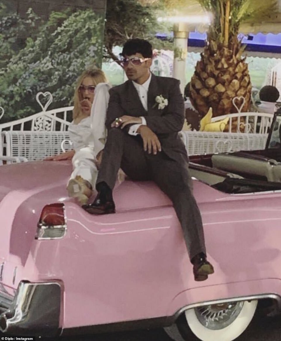وخلال وقت سابق، أقام الثنائي حفل زفاف أول في لاس فيغاس، جاء بطابع الستينيات، حيث عقد زواجهما قس اعتمد إطلالة المغني إلفيس، كما ارتدت صوفي فستان أبيض من الساتان بتصميم قديم، وفي صورة أخرى ظهر الثنائي على سيارة من موديل ذلك العهد باللون الوردي.