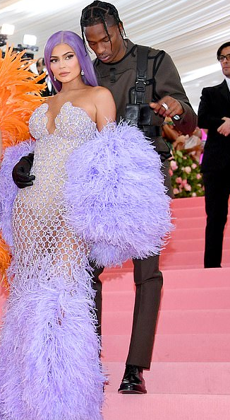 أثناء ظهورها بحفل الميت غالا، اختارت كايلي إطلالة بالأرجواني من رأسها إلى أخمص قدميها، وارتدت فستانًا براقًا مزينًا بالريش ذو أكمام ضخمة من الريش من توقيع "فيرساتشي"، وكانت برفقة ترافيس الذب ارتدى بدلة ذات تصميم غير تقليدي باللون البني، بينما أطلت كايلي بفستان براق للغاية بدرجة زاهية من الأخضر وتميز أيضًا بقطعة ضخمة من الريش.